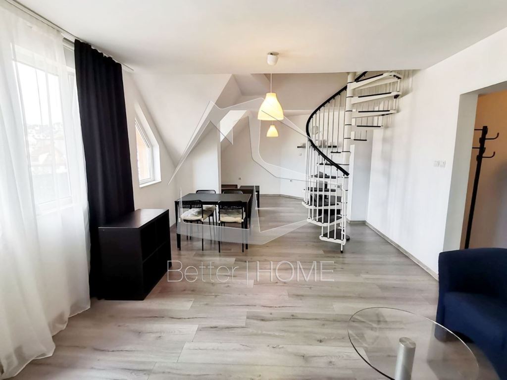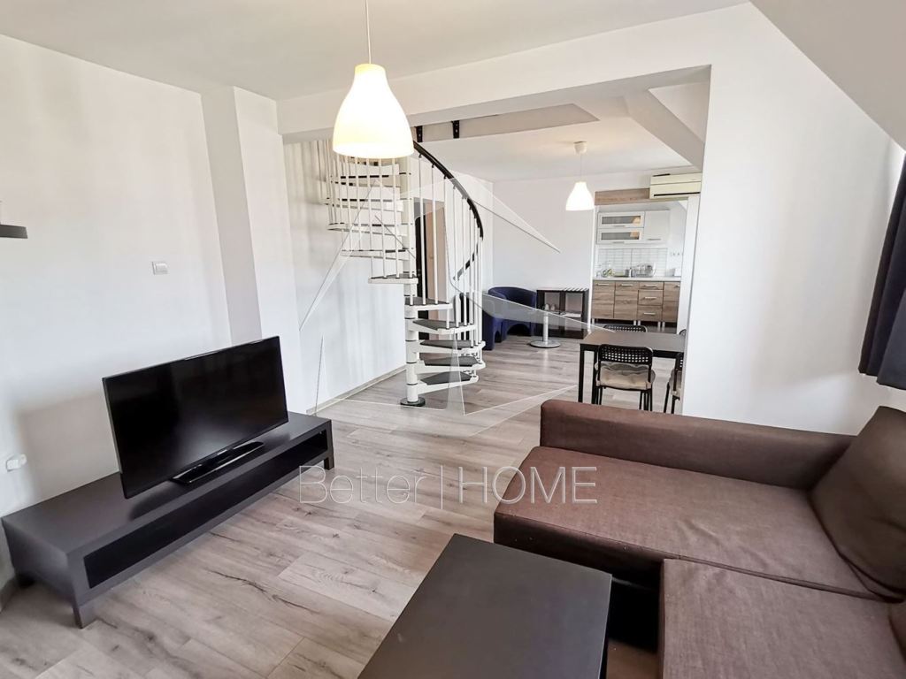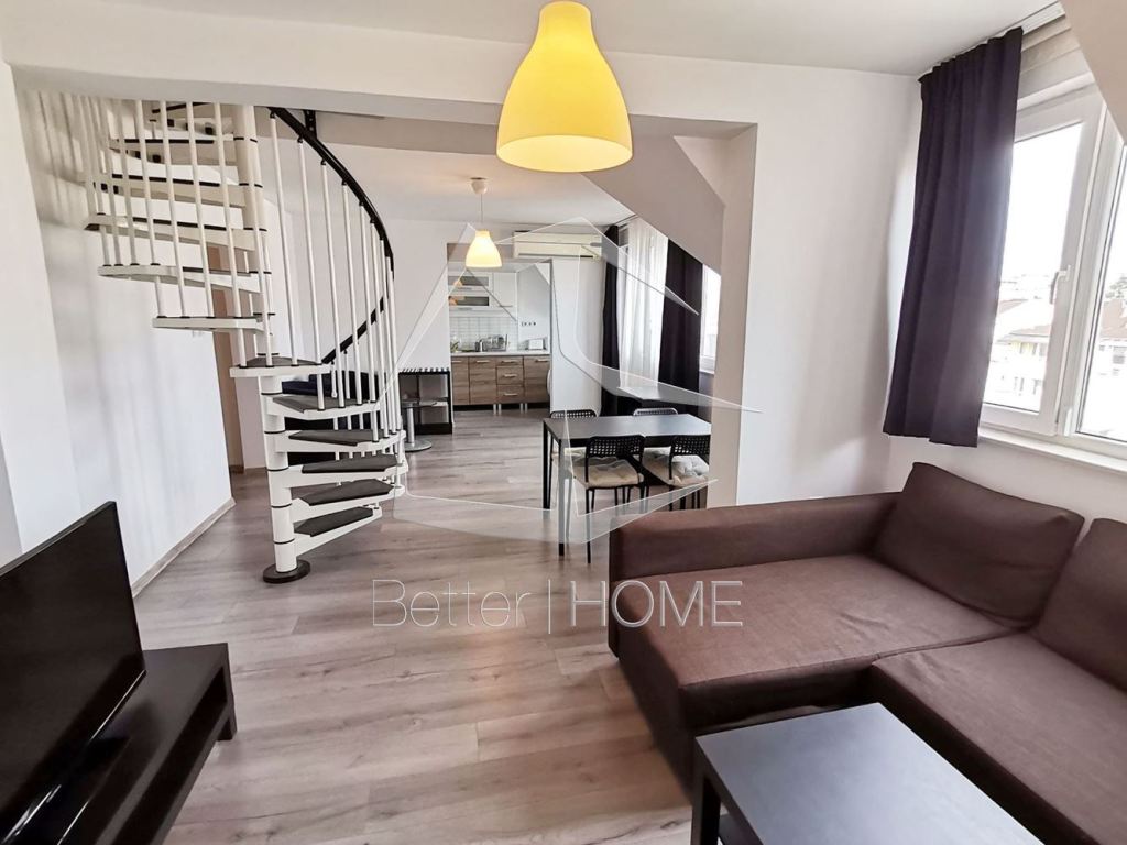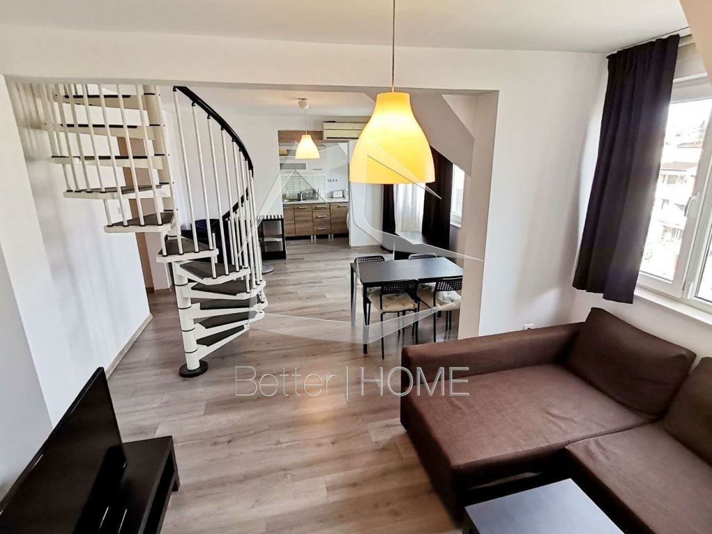 Агенция Бетър хоум предлага отлично обзаведен двустаен апартамент-тип мезонет в един от най-престижните квартали на София. Апартамента е разположен в кооперация тип ново строителство и разполага с :първи етаж коридор, тоалетна, хол със кухненски бокс, тераса. Втори етаж спалня със баня и тоалетна. Обзавеждането е ново ( година и половина откакто е закупено), нов климатик който отоплява първи етаж, конверторна печка, а в спалнята е конверторен радиатор от най-висок клас. Напълно обзаведен, има и ТВ 42 инча.